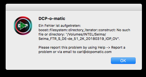 You get the first annual DCP-o-matic bravery award! The logging in the player is fairly minimal. Please could you install 2.13.120, go into prefs and set a file name for the "debug log" option. Then send me the contents of that file after a crash? |
