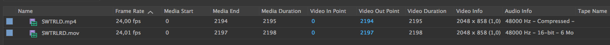 | Description | Hi,I just wanted to let you know that there are some problem now with prores export on DoM v. 2.14.8. I did a little comparison and exported a DCP trailer in true 24fps to prores with DoM and since i also run a digital cinema lab here in Iceland and i own Dolby Cineasset Pro i did the same from there. Both of those screenshot is from Adobe Premiere Pro after i import the trailers there.