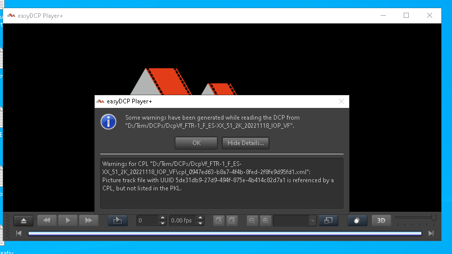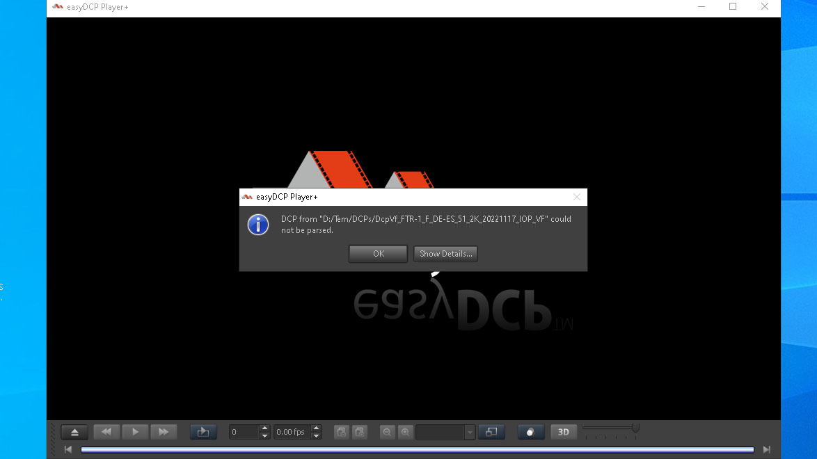 Thank you! Loading the DE VF into the DCP-o-matic player, then adding the OV works for me (I see picture, sound and subtitles) so something a bit strange is happening. It would be great if you could set up a log file in the DCP-o-matic player (in preferences), then try loading the VF and adding the OV. Then the log file would be Also, what do you get if you click "Show details" in that EasyDCP error window? |