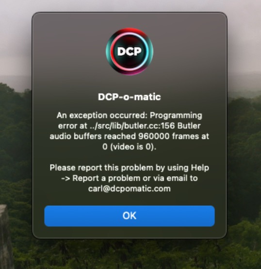 | Description | An exception occurred: Programming error at ../src/lib/butler.cc:156 Butler audio buffers reached 960000 frames at | ||||
