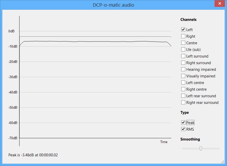 | Description | I tested import a DCP into DCP-o-matic 2.1.26, but when I make the DCP, it's created quickly because the video is jpeg2000, but the audio sounds saturated. Using the "Show audio" button, I can see that the peak and the RMS, as a flat graphic. | ||||