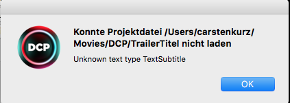 Ah, right, OCAP+CCAP DCP as content that's what you were after with 'I was just wondering whether it's common to have both subs and closed captions in a single DCP...' Yeah, no big deal, I just noticed it would work for a standard project with separate OCAP and CCAP content. The switching tabs may be a bit confusing for the long-time users at first, at the same time, why have all these tabs when they are no use for the currently selected content. Oops - I just wanted to open a CCAP test project (Bunny with some CCAP) I created yesterday with 2.13.38 - but right after choosing the folder or 'recent files', DCP-o-matic vanishes silently. Means, I can not open a project that contains CCAPs. OS X. edit: also happens with subtitles. Also, see attached screen shot 'Could not load film' - that is from a pre-existing project I tried to load. It does appear as if the CCAP addition changed something about subtitle content interpretation in project files?