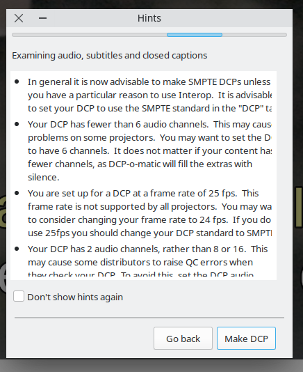 | Description | Before making a dcp, a window with hints is shown. However, it is fixed size, making it not so good when multiple hints are displayed as some are not visible. Also the text overflows and is partly not displayed (see screenhot). What should be done: